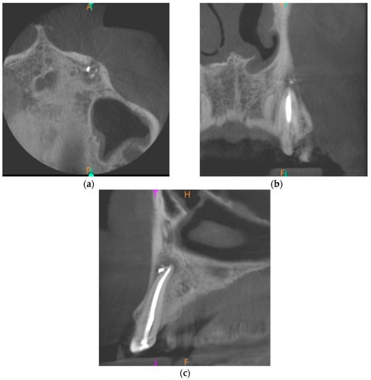 CBCT images presenting the healing process of the periapical lesion around the root of tooth no. 23 (date of CBCT examination: 29 June 2021): (a) axial view; (b) coronal view; and (c) sagittal view.