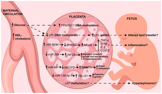 The main placental epigenetic alterations associated with GDM. Epigenetic alterations and their effects on target genes are shown (see the text for deeper details). Interestingly, some explain, in part, the well-known pro-inflammatory status and excessive growth of the placenta. On tissue, solid arrows indicate up-regulation or down-regulation in maternal circulation and the fetus indicate low or high circulating levels. Dotted line arrows indicate association. HDL-cholesterol: high-density lipoprotein cholesterol; mRNA: messenger ribonucleic acid; FFA: free fatty acids; PPARα: proliferator-activated receptor alpha; NF-κB: nuclear factor-kappa B; TNF-α: tumoral necrosis factor alpha; IL-1β: interleukin 1 beta; IL-6: interleukin 6; COX-2: cytochrome C oxidase subunit II; HIF3A: hypoxia inducible factors 3A; MECP2: methyl CpG binding protein 2; DNMT1, DNA methyltransferase 1; TBL1X: transducin β–like protein 1; LEP: leptin.