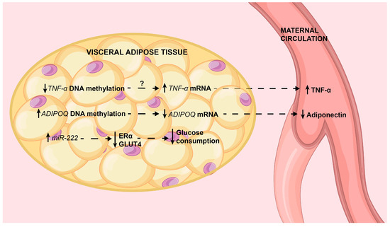 The main epigenetic alterations in visceral adipose tissue associated with GDM. Epigenetic alterations and their effects on target genes are shown (see the text for deeper details). These findings explain in part the well-known pro-inflammatory status, decreased production of adiponectin and insulin resistance in visceral adipose tissue. In tissue, solid line arrows indicate or up-regulation or down-regulation; in maternal circulation they indicate low or high circulating levels. Dotted arrows indicate associations. TNF-α: tumoral necrosis factor alpha; ADIPOQ: adiponectin; ERα: estrogen receptor alpha; GLUT4: glucose transporter 4.