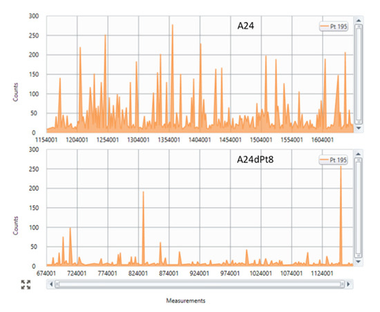 Single cell inductively coupled plasma mass spectrometry (SC-ICP-MS) representative sections of (Pt 195) counts versus time traces in A24 cells and A24dPt8 cells. This figure shows real-time signal processing by Syngistix. It becomes apparent that less Pt is measured in resistant cells (bottom panel) than compared to wild type (wt) cells (top panel), independent of the measured time point (x-axis). Each “intensity peak” represents accumulated Pt 195 counts for a defined time interval (dwell time) of 50 μs. Each time interval correspond to one “single measurement” (x-axis). Assumption: each peak (measurement) corresponds to one individual entity analyzed (cell, cells aggregate).