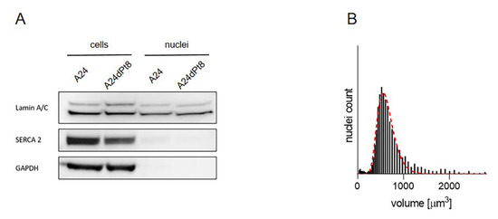 Isolation of intact nuclei. (A) The purity of the nuclear fraction was assessed using Lamin A/C (nuclear marker), SERCA2 ATPase (ER marker) and GAPDH (cytoplasmic marker) by Western blot. Column 1 and 2 show the cell extracts of A24 and A24dPt8, column 3 and 4 show the A24 isolated nuclei and the A24dPt8 isolated nuclei. (B) Representative volume distribution of isolated nuclei from A24 cells. The red curve shows the lognormal fit of the frequency.