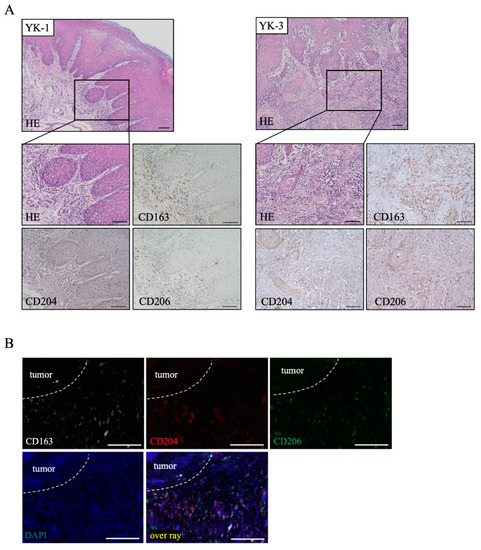 Distribution of tumor-associated macrophages (TAMs) in oral squamous cell carcinoma (OSCC). (A) Immunohistochemical staining of OSCC sections with H&E and CD163, CD204, and CD206 antibodies (brown). Scale bars: 100 μm. (B) Triple immunofluorescence staining was performed for CD163 (white), CD204 (red), and CD206 expressions (green); nuclei were stained with DAPI (blue). Scale bars: 100 μm. YK, Yamamoto–Kohama criteria.