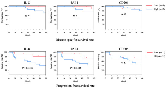 To evaluate the involvement of IL-8 and PAI-1 in the clinical prognosis of OSCC patients, survival rates were estimated by using the Kaplan–Meier method. The OSCC patients were divided into low- and high-expression groups according to the mean number of IL-8+, PAI-1+, or CD206+ cells. In the disease-specific survival rate, there were no significant differences in low and high IL-8+, PAI-1+, or CD206+ expression. In the progression-free survival rate, patients with high IL-8+ or PAI-1+ expression had a significantly more unfavorable outcome than those with low-expression groups. On the other hand, patients with high CD206+ expression showed a lower progression-free survival rate than those with the low-CD206+-expression group, but there was no significant difference between low- and high-CD206+-expression groups (Figure 5). According to the above results, a higher sensitivity and specificity of IL-8+ and PAI-1+ expression were found for adverse prognosis.