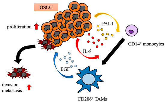 Schematic model of the interaction between OSCC and TAM subsets. OSCC cells enhance CD14+ monocytes to differentiate into CD206+ TAMs via PAI-1 and IL-8 production, and CD206+ TAMs shape the tumor microenvironment toward tumor progression, including increased proliferation, invasion, and metastasis via epidermal growth factor (EGF) production.