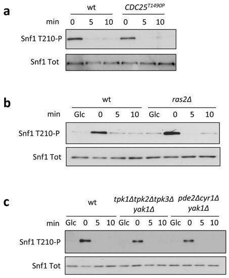 The Snf1/AMPK activation state is controlled by phosphorylation of the regulatory residue Thr210—a substrate of both the upstream kinases (Sak1, Tos3, and Elm1) and the Reg1/Glc7 phosphatase [15,16]. Glucose availability promotes Snf1-T210 dephosphorylation, while growth on non-fermentable carbon sources is associated with a high level of Snf1/AMPK phosphorylation. As already reported, PKA phosphorylates Sak1, inducing a mild reduction in Snf1/AMPK phosphorylation [8]. According to another report, the activity of Snf1/AMPK upstream kinases is not influenced by glucose availability [17]. In addition, Reg1/Glc7 phosphatase is activated by glucose in a Ras/PKA-dependent manner [16]. Taken together, all of these observations prompted us to better investigate the involvement of the Ras/PKA pathway in the control of the phosphorylation state of Snf1/AMPK.