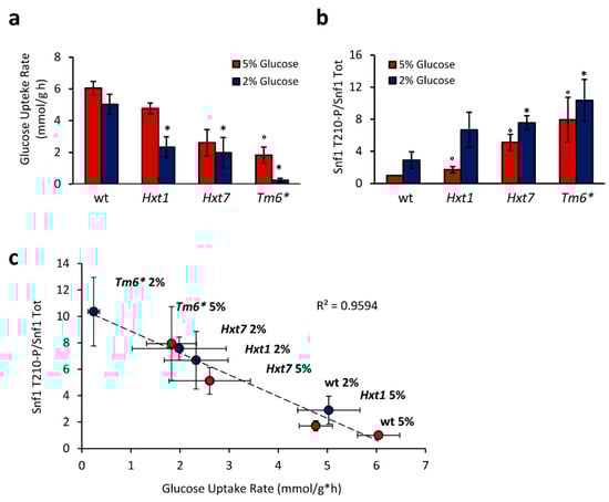 Snf1-T210 phosphorylation correlates with glucose transport rate. (a) Glucose uptake rate and (b) Snf1-T210 phosphorylation level measured in 2% and 5% glucose media of yeast strains expressing only Hxt1, Hxt7, or the chimeric transporter Tm6*, under a constitutive, non-glucose-responsive promoter. Mean ± standard deviation is shown (n = 3 for each). * p < 0.05 relative to wt in 2% glucose; ° p < 0.05 relative to wt in 5% glucose (t-test). (c) Linear correlation between Snf1 phosphorylation and glucose uptake rate shown in (a,b).