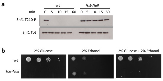 To confirm that Snf1/AMPK activation depends on glucose transport, we carried out shift-up experiments using a strain deleted in all of the hexose transporters (Hxt-Null) and unable to grow on glucose due to its inability to import glucose from the medium [22]. The addition of glucose to ethanol-grown cells induced rapid and almost complete dephosphorylation of Snf1/AMPK in the wild-type strain (Figure 3a). Conversely, in the Hxt-Null mutant, Snf1/AMPK phosphorylation remained high after the addition of glucose, without any significant decrease until 60 min (Figure 3a). These data demonstrate that if glucose import is prevented, Snf1/AMPK dephosphorylation is completely impaired.