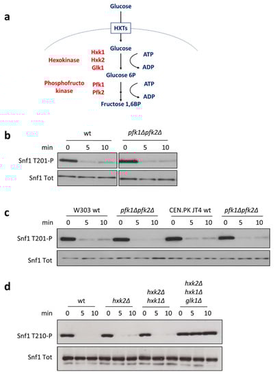 Next, we investigated the role of hexokinases (Hxk1, Hxk2, and Glk1), given that glucose-6-phosphate (G6P) synthesis was already suggested to influence Snf1/AMPK phosphorylation state [5]. Among yeast hexokinases, Hxk2 represents the catalytically dominant form, which also has a regulatory function involved in the maintenance of glucose repression [26]. Nevertheless, Snf1/AMPK dephosphorylation in the hkx2∆ strain still responded to the addition of glucose, suggesting that Hxk2’s regulatory function is not involved in the control of Snf1/AMPK activation (Figure 4d). Similarly to hxk2Δ cells, the double-deleted hxk1Δhxk2Δ strain also showed rapid dephosphorylation of Snf1/AMPK upon the addition of glucose (Figure 4d), while only the triple-mutant hxk1Δhxk2Δglk1Δ, completely lacking hexokinase activity, resulted in a loss of Snf1/AMPK dephosphorylation (Figure 4d). These results are consistent with a recent publication showing that G6P—and not F1,6BP—concentration peaks within a few minutes after the addition of glucose [13].
