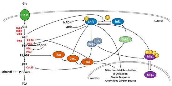 Schematic representation of the interactions between the glycolysis, Ras/PKA, and Snf1/AMPK pathways. F1,6BP synthesis influences Ras/PKA activity which, in turn, phosphorylates Pfk26 and Cdc19, stimulating the glycolytic flux. G6P promotes Snf1/AMPK dephosphorylation, thus inhibiting the kinase. NADH and ADP interact with Snf1/AMPK, giving rise to an interaction hub for the monitoring of cellular metabolism. Active PKA stimulates Reg1/Glc7 and reduces Sak1 activity, without influencing the Snf1/AMPK phosphorylation state, during a nutritional shift-up. In turn, phosphorylated Snf1/AMPK inhibits Cyr1 and Pfk27 activity and prevents Mig1 nuclear translocation. As a final result, PKA and Snf1/AMPK alternatively regulate the expression of genes involved in mitochondrial metabolism, stress response, and alternative carbon metabolism.