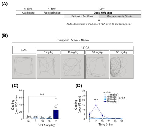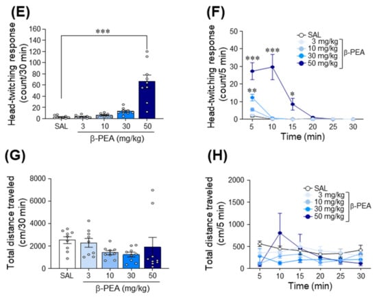 2.1. Acute β-PEA Significantly Increased Circling and Head-Twitching Behaviors in Mice