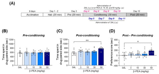 2.2. β-PEA Significantly Produced Conditioned Place Preference in Mice