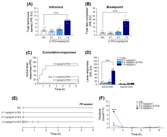 2.5. β-PEA Produced a Higher Breakpoint in Self-Administration under Progressive Ratio Schedules of Reinforcement in Rats