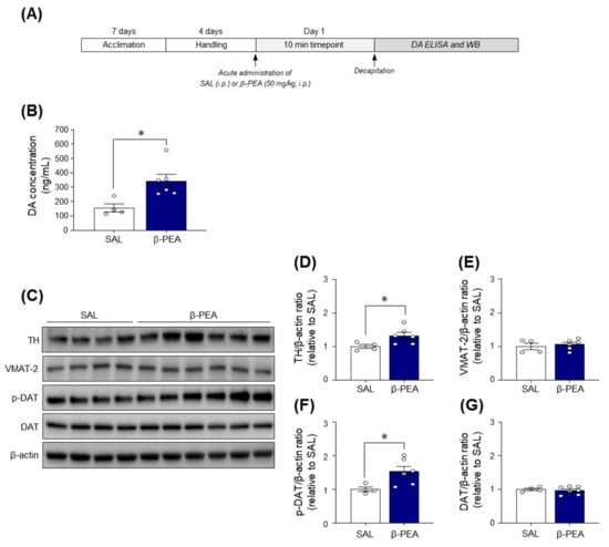 2.6. Acute β-PEA Administration Significantly Increased DA Concentration and p-DAT and TH Expression in the Dorsal Striatum of Mice