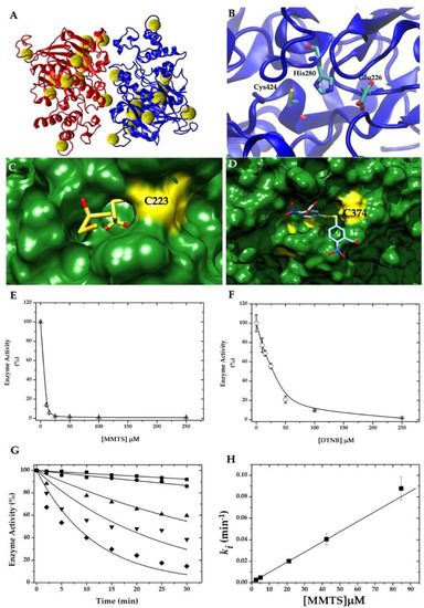 Since the complete 3D structure of GlADI is still unknown, homology modeling was used to identify potential inhibitors by docking [18]. We used the crystallographic structure of the arginine deiminase from Mycoplasma arginini as a template to model the GlADI 3D structure. This led to a number of observations. First, it revealed the abundance and distribution of the Cys residues in the three-dimensional arrangement of the homodimer, and second, it allowed us to identify the preferential binding sites of the highly Cys-reactive compounds MMTS and DTNB on the protein surface. After in silico approximations, the effect on the enzyme activity of MMTS and DTNB was determined in vitro, and finally, the free cysteine content was determined using Ellman’s method to establish the underlying mechanism of inactivation by modification of cysteines.