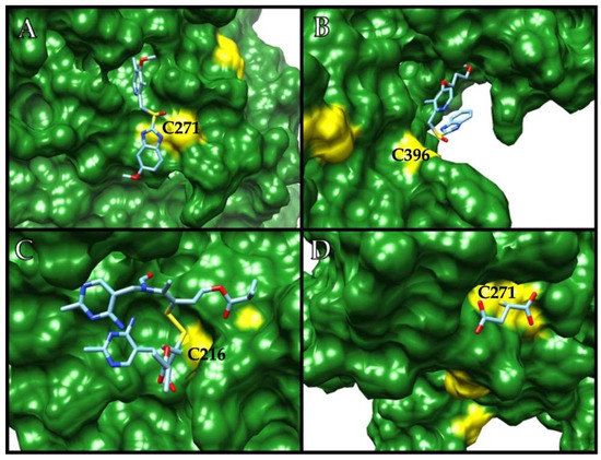 Representative docking of GlADI with (A) omeprazole, (B) rabeprazole, (C) sulbutiamine, and (D) aurothiomalate. Cysteine residues near the binding sites are yellow-colored. Cysteine residues interacting with each of the molecules are indicated in bold type.
