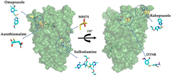Based on the in vitro susceptibility of GlADI to being inactivated through a cysteine modification process, we studied four different thiol-reactive drugs: omeprazole, rabeprazole, sulbutiamine, and aurothiomalate, which are known to be safely used in humans but not for giardicidal purposes. As expected, the docking performed on the surface of the enzyme showed several possible binding sites near cysteine residues for all the studied drugs (representative binding sites for each drug are shown in Figure 2A–D). Moreover, an overall view of the GlADI monomer A shows the putative binding sites of the studied molecules on the general topography of the protein (Figure 3).