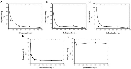 The Cys residues were determined using Ellman’s reagent under non-denaturing and denaturing conditions [42]. To carry out the experiments, 0.5 mg/mL of GlADI was incubated, either without compounds or with 250 µM DTNB and MMTS, separately, or with 750 µM omeprazole, rabeprazole, sulbutiamine, or aurothiomalate, separately. Each mix was incubated for 2 h at 25 °C. After the incubation period, the samples were extensively washed by ultrafiltration with Centricon filters to eliminate the excess drug, and the protein concentration was estimated by determining the absorbance at 280 nm. Next, the free Cys content of the samples was spectrophotometrically quantified as follows: the basal absorbance of 1 mM DTNB and 5% SDS dissolved in lysis buffer was measured at 412 nm (ε 412 nm = 13.6 mM/cm), and the increase in absorbance following the addition of 200 µg of protein was monitored. The number of modified Cys residues was indirectly calculated by subtracting the number of free Cys residues in the derivatized enzyme (treated with the drugs) from the number of free Cys residues in the enzyme in the absence of the drugs. The results represent the mean ± SD of at least four independent experiments.