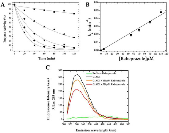 Since rabeprazole showed an efficient inhibition of the enzyme activity on recombinant GlADI (Figure 4B), we calculated the pseudo-first-order inactivation rate constant for this drug (Figure 5A,B). The results show that the kinetics of inhibition using different concentrations of rabeprazole decay following a mono-exponential function (Figure 5A). This data fitted onto a straight-line with a second-order rate constant (k2) value of 6.72 ± 0.2 M−1 s−1 (Figure 5B).