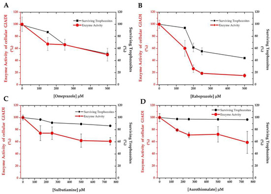 G. lamblia WB strain was acquired from the American Type Culture Collection (ATCC) and cultured, harvested, and maintained as previously described [27]. Trophozoites were cultured in the presence of increasing concentrations of omeprazole, rabeprazole, sulbutiamine, or aurothiomalate for 24 h at 37 °C, at the concentrations shown in Figure 5. At the end of the treatment period, the tubes were decanted to preserve only the adhered trophozoites (trying to keep only living cells, and without mixing with dead cells). Nonetheless, the living and dead trophozoites were counted from these supernatants to register the total viability after the treatments. The culture tubes were washed three times with phosphate-buffered saline (PBS), pH 7.4, and chilled on ice for 20 min, and then the trophozoites were counted to standardize the assays by the number of cells. The cells were disrupted with five cycles of freeze–thaw cycles in liquid N2 and 42 °C, in lysis buffer. Disrupted cells were centrifuged at 15,700× g for 20 min at 4 °C, and the supernatants were withdrawn for analysis of residual GlADI activity using the coupled method mentioned above, at 25 °C. We considered 100% to be the enzyme activity registered for the cultures without drugs.