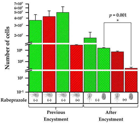 Impairment of Giardia encystment by rabeprazole. Green columns represent the control group (without rabeprazole), and the red columns represent the experimental group (exposed to rabeprazole). From left to right, the first two columns represent the number of cells grown to confluence at the beginning of the experiment in TYI−S−33 culture medium. The next two columns represent the number of cells grown in pre-encystment culture medium. The last four columns represent the number of cells grown in encystment culture medium. These results are the medium ± SD of three assays, with three technical replicates.
