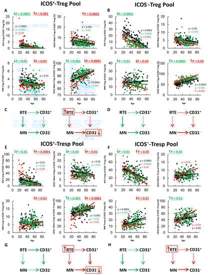 Changes in the composition of the total ICOS+- and ICOS−-Treg/Tresp pools with age in healthy volunteers, SLE patients in remission and SLE patients with active disease. The percentage of RTEs, MNs, CD31+-memory cells and CD31−-memory cells is shown for the ICOS+-Treg Pool (A), the ICOS−-Treg pool (B), the ICOS+-Tresp pool (E) and the ICOS−-Tresp pool (F) in healthy volunteers (Black coloured), SLE patients in remission (Green coloured) and in SLE patients with active disease (Red coloured). The figures present the regression lines concerning the changes in the percentages of the individual Treg/Tresp cell subsets with age. Significant age-dependent changes are marked by black, green, or red P-values. Significant age-independent differences between healthy volunteers and SLE patients in remission or SLE patients with active disease are marked by green or red underlined P-values. Age-independent increased differentiation of ICOS+ and ICOS−- RTE-Tregs/Tresps into CD31−-memory Tregs/Tresps via MN-Tregs/Tresps or CD31+-memory Tregs/Tresp is shown for SLE patients in remission (green arrows) and for SLE patients with active disease (red arrows) (C,D,G,H). Further information of the calculated P-values is illustrated in Table S1.