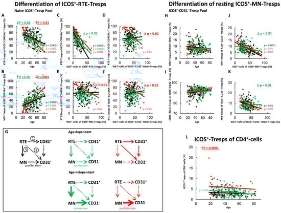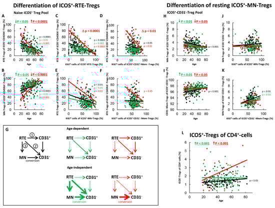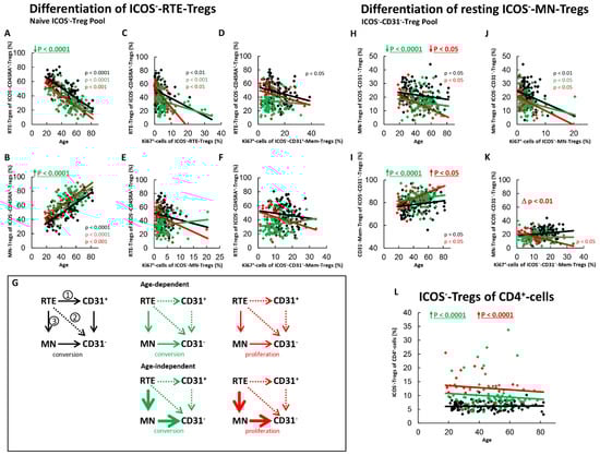 Figure 2 shows the results of these measurements concerning the differentiation of ICOS+-RTE-Tregs and resting ICOS+-MN-Tregs. For healthy controls, we found significantly decreasing percentages of RTE-Tregs and complementary increasing percentages of MN-Tregs within the naïve ICOS+-Treg pool with age (Figure 2A,B) and ascertained a significant negative correlation between the percentage of RTE-Tregs within naïve Tregs and the percentage of Ki67+ cells within total RTE-Tregs (Figure 2C). These data indicate a significant activation of ICOS+-RTE-Tregs with decreasing percentages of RTE-Tregs within their naive Treg pool (Figure 2C). As there was a similar significant negative correlation between the percentage of RTE-Tregs within naïve Tregs and the percentage of Ki67+ cells within CD31+-memory-Tregs (Figure 2D) and MN-Tregs (Figure 2E), it seems that with age, ICOS+-RTE-Tregs are activated and differentiate into CD31+-memory-Tregs, which subsequently proliferate into CD31−-memory-Tregs (Figure 2G, pathway 1), but also proliferate directly via MN-Tregs into CD31−-memory-Tregs (Figure 2G, pathway 2). A significant correlation between the percentage of RTE-Tregs and the percentage of Ki67+ cells within CD31−-memory-Tregs was not found (Figure 2F), indicating that with age, an additional differentiation pathway must exist which compensates the increasing percentage of Ki67+ cells within the CD31−-memory pool, caused by the increasing proliferation of RTE-Tregs and CD31+-memory-Tregs. To examine whether the differentiation of resting MN-Tregs could perform this task, we determined the percentages of MN-Tregs within total ICOS+-CD31−-Tregs and correlated its percentage with the percentage of Ki67+ cells within total MN-Tregs and within total CD31−-memory-Tregs (Figure 2H,K). We found significantly decreasing percentages of MN-Tregs and complementary increasing percentages of CD31−-memory-Tregs with age, indicating that resting-MN-Tregs additionally differentiate into CD31−-memory-Tregs (Figure 2H,I). We could not detect a significant correlation between the percentage of MN-Tregs within total CD31−-Tregs and their percentage of Ki67+ cells, proposing that RTE-Tregs, after proliferating into resting MN-Tregs, differentiate immediately into CD31−-memory-Tregs, without any activation induced regulation (Figure 2J, pathway 3). As there was a significant positive correlation between the percentage of MN-Tregs within total CD31−-Tregs and the percentage of Ki67+ cells within CD31−-memory-Tregs (Figure 2K), it can be assumed that the differentiation of resting MN-Tregs, presumably by their conversion, reduces the proliferation capacity of CD31−-memory-Tregs, keeping them susceptible to further activation (Figure 2G, pathway 3). In summary, it seems that the increased age-dependent differentiation of IOCS+-RTE-Tregs via all three pathways causes a significant increase of total ICOS+-Tregs within total CD4+-helper cells with age (Figure 2L).