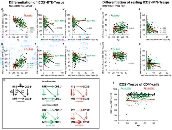 Figure 3 shows the differentiation of ICOS+-RTE- and resting ICOS+-MN-Tresps of all three patient groups. For healthy controls, we found an age-dependent shift in the composition of the total naïve ICOS+-Tresp pool in favor of MN-Tresps (Figure 3A,B). A significant correlation between its percentage of RTE-Tresps and their percentage of Ki67+ cells indicated a significant activation of the RTE-Tresps with age (Figure 3C). However, a significant correlation between the percentage of RTE-Tresps and the percentage of Ki67+ cells within total MN-, or CD31+-memory-Tresps was not detectable (Figure 3D,E). Therefore, the ICOS+-RTE-Tresps do not seem to differentiate via CD31+-memory-Tresps (Figure 3G, pathway 1) or direct proliferation (Figure 3G, pathway 2) into CD31−-memory-Tresps, but rather differentiate via resting MN-Tresps into CD31−-memory Tresps. This is recognizable by the fact that the naive Tresp pool shifts significantly with age in favor of MN-Tresps (Figure 3A,B), whereas the CD31−-Tresp pool remains unchanged (Figure 3H,I). Since a significant correlation between the percentage of resting-MN-Tresps within total CD31−-Tresps and their percentage of Ki67+ cells within resting MN-Tresps was ascertained (Figure 3J), it must be assumed that resting MN-Tresps are activated in case of their decreased production and thereby forced to differentiate into CD31−-memory-Tresps. In healthy controls, such a differentiation of resting MN-Tresps seems to occur with age. However, in contrast to ICOS+-resting MN-Tregs, these cells do not appear to be converted into CD31−-memory Tresps, but rather proliferate into CD31−-memory-Tresps, since the proportion of Ki67+ cells within CD31−-memory-Tresps increases significantly with increasing differentiation of resting MN-Tresps into CD31−-memory Tresps (Figure 3K). Therefore, it seems that there is a significant age-dependent differentiation of RTE-Tresps into resting MN-Tresps (Figure 3G, pathway 3) which proliferate into CD31−-memory-Tresps in healthy controls. As the differentiation of ICOS+-RTE-Tresps is limited to pathway 3, an age-related increase of ICOS+-Tresps within total CD4+-T-helper cells could not be determined (Figure 3L).