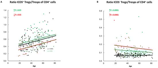 Ratio of ICOS+-Tregs/Tresps or ICOS−-Tregs/Tresps within total CD4+-T-helper cells. The ratio of ICOS+-Tregs/Tresps (A) as well as the ratio of ICOS−-Tregs/Tresps (B) is shown for healthy controls (Black coulored), SLE patients in remission (Green coloured) and SLE patients with active disease (Red Coloured). The figures present the regression lines concerning the changes with age. Significant age-dependent changes are marked by black, green, or red P-values. Significant age-independent differences between healthy volunteers and SLE patients in remission or SLE patients with active disease are marked by green or red underlined P-values. Further information of the calculated P-values is illustrated in Table S1.