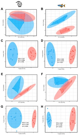 The PCA and OPLS-DA score plots of each model. (A) The PCA score plot of CUMS in mice. (B) The PCA score plot of CUMS in zebrafish. (C) The OPLS-DA score plot of CUMS in mice. (D) The OPLS-DA score plot of CUMS in zebrafish. (E) The PCA score plot of reserpine in mice. (F) The PCA score plot of reserpine in zebrafish. (G) The OPLS-DA score plot of reserpine in mice. (H) The OPLS-DA score plot of reserpine in zebrafish. Blue represents Control group, red represents model group.