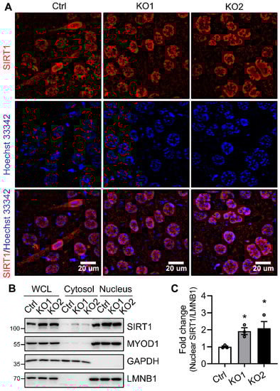 2.5. Neddylation Deficiency Causes SIRT1 Accumulation in the Nucleus during the Early Stage of Myoblast Differentiation