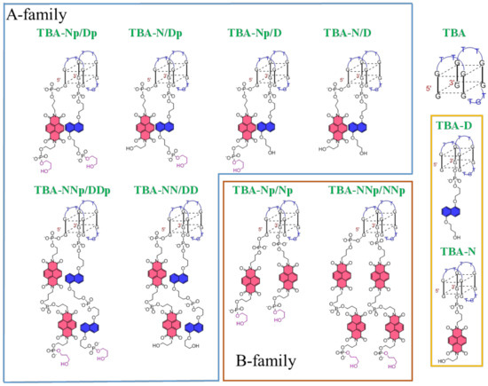 Herein, we report the design, synthesis and biophysical/biological characterization of novel TBA derivatives, for which the TBA sequence was conjugated at its 5′ and 3′ ends with NDI (N) and DAN (D) units, respectively, and a terminal 1,3-propanediol monophosphate group (p) was provided to some, thereby leading to TBA analogues with one or two N/D pairs (TBA-Np/Dp, TBA-N/Dp, TBA-Np/D, TBA-N/D, TBA-NNp/DDp and TBA-NN/DD, A-family, Figure 1). The terminal 1,3-propanediol monophosphate group (p) was introduced to some analogues to partially counterbalance the lipophilic contribution to the aptamer given by the NDI and DAN residues and thus vary the overall hydrophilic/lipophilic effects in the investigated TBA series. Then, for comparison, only NDI moieties were introduced at both extremities, providing TBA analogues with one or two N/N pairs (TBA-Np/Np and TBA-NNp/NNp, B-family; Figure 1). Furthermore, the derivatives carrying at their 3′ ends a single DAN (TBA-D) or NDI (TBA-N) were also prepared and studied as reference compounds (Figure 1). In the A-family of the investigated TBA analogues, the G-quadruplexes are stabilized by charge transfer interactions that are an enhanced variant of π–π stacking [53]. In the B-family, the G4 structures are stabilized by classical π–π stacking. TBA analogues with only DAN at both ends were not considered, since it is already known that a D/D pair causes destabilization [54].