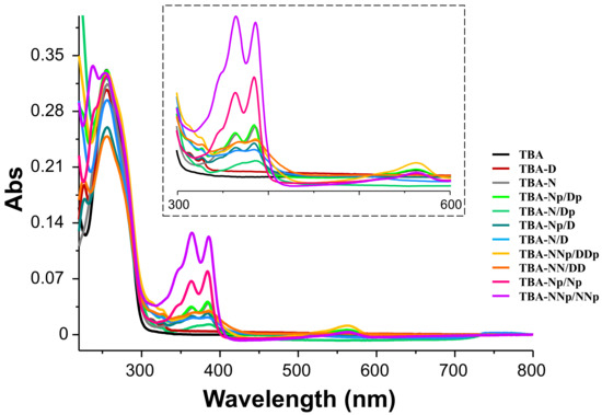 Overlapping UV-vis spectra of the pseudocyclic TBA derivatives in comparison with unmodified TBA, TBA-D and TBA-N, used as reference sequences. All the investigated oligonucleotides were analyzed at 2 µM in H2O at room temperature. The inset shows an enlargement of the 300–600 nm region of the spectra, to better highlight the characteristic UV-vis contribution of naphthalene diimide groups and the charge transfer band around 560 nm or the NDI exciplex band.