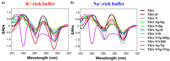 In both K+- and Na+-rich solutions, all the TBA analogues investigated exhibited normalized TDS profiles featuring two positive (at ca. 240 and 275 nm) and two negative bands (around 260 and 295 nm), which are similar to those of unmodified TBA (Figure 3, black line) and are characteristic of G4 structure formation [61,62,63,64].
