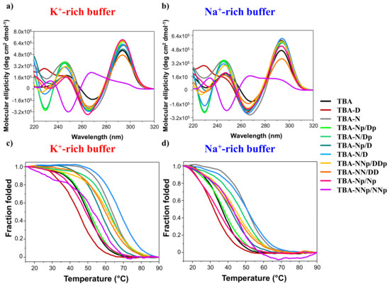 Notably, in the Na+-rich buffer, the apparent Tm value recorded for TBA-Np/Dp was roughly equal to 37 °C, and both TBA-Np/Np and TBA-D were poorly folded at physiological temperature (Figure 4 and Table 1).