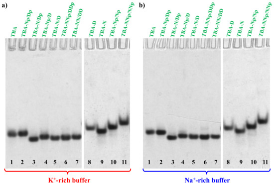 In detail, TBA-N/Dp, TBA-Np/D, TBA-N/D, TBA-NNp/DDp and TBA-NN/DD analogues (lanes 3–7, Figure 5) exhibited slightly increased electrophoretic mobility with respect to unmodified TBA, as previously observed for its cyclic derivatives [46,47]. As far as TBA-Np/Dp and TBA-N are concerned (lanes 2 and 9), these TBA variants showed similar migration abilities to their natural counterpart, whereas TBA-D, TBA-Np/Np and TBA-NNp/NNp (lanes 8, 10 and 11) migrated slightly slower than unmodified TBA.