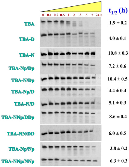 The susceptibility of a selected oligonucleotide to nuclease degradation in serum is one of the most crucial parameters for its potential in vivo use. The chemical conjugation at the 5′ and/or 3′ ends of the TBA sequence with a selected probe generally prevents exonuclease attacks. Thus, TBA functionalization with NDI and/or DAN moieties was expected to markedly improve the nuclease resistance of the TBA analogues prepared, in analogy to other end-modified TBA derivatives [32,46,47,90,91,92,93]. In order to evaluate their stability in serum, all the TBA derivatives were tested in their resistance against enzymatic digestion in fetal bovine serum (FBS) in comparison with the unmodified aptamer. To this aim, in parallel experiments, all the aptamers—previously dissolved and annealed in the selected Na+-rich buffer (i.e., PBS)—were incubated in 80% (v/v) FBS at 37 °C and monitored for 24 h. At fixed times, aliquots of these mixtures were collected, supplemented with formamide to immediately stop the nuclease degradation and then loaded on 20% denaturing gel (Figure 6). The intensity of each oligonucleotide band on the gel at the different analyzed time points was then calculated and expressed as a normalized percentage with respect to that of the untreated oligonucleotide. Fitting of the experimental percentages of the remaining aptamer allowed the calculation of the half-life (t1/2) values, i.e., the time at which the amount of the sample decayed by 50%. Percentages of each remaining aptamer along with the corresponding fitting curves are represented for each system in Figure S14.