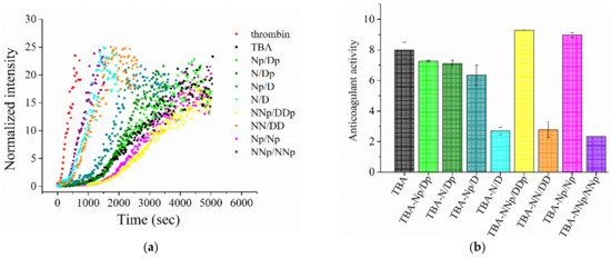 The anticoagulant activity of pseudo-cyclic TBAs with respect to natural TBA is reported in Figure 7b and Table S3, from which the following trend is derived: TBA-NNp/DDp ≅ TBA-Np/Np > TBA > TBA-Np/Dp ≅ TBA-N/Dp > TBA-Np/D ≫ TBA-N/D ≅ TBA-NNp/NNp.
