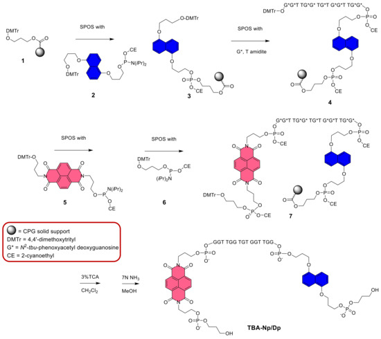 Solid-phase oligonucleotide synthesis (SPOS) of TBA-Np/Dp.