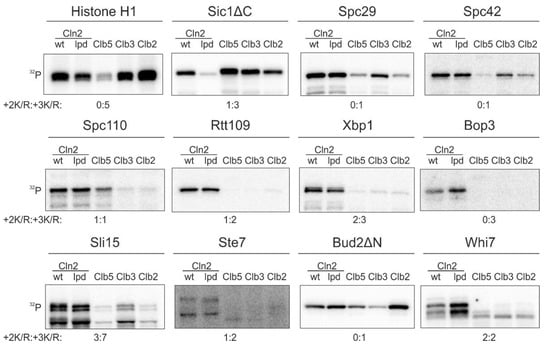 A substrate docking interaction different from the known LP interaction, governs the phosphorylation specificity of a group of key targets of G1-Cdk1. 32P-autoradiographs showing phosphorylation of Cdk1 targets by the four major cyclin-Cdk1 complexes and the LP docking deficient Cln2(lpd)-Cdk1. +2K/R:+3K/R shows the number Cdk1 consensus phosphorylation sites with basic residue in +2 position and +3 position. The experiments were performed twice, a representative example is shown.