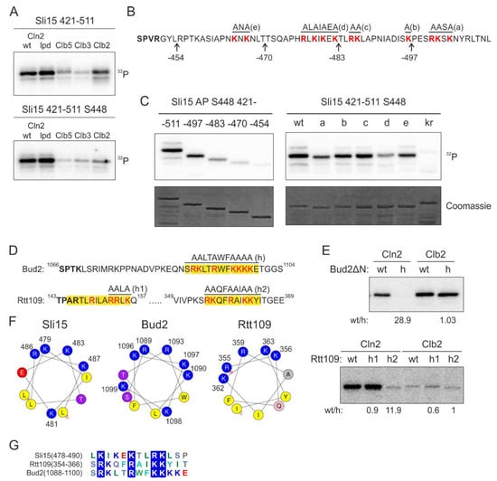 Clusters of basic residues promote phosphorylation by G1-Cdk1. (A) 32P-autoradiographs of phosphorylation reactions of Sli15 fragment 421–511 with all phosphorylation sites (upper panel) or with just S448 as the only Cdk1 consensus site by different cyclin-Cdk1 complexes in vitro. (B) Sequence of Sli15 positions 448–511 showing the truncations and mutations used in panel C. (C) Phospho-images showing phosphorylation of the Sli15 mutants by Cln2-Cdk1. The mutants are described in ‘B’. In the kr mutant, all highlighted K/R residues are mutated to N/Q residues, respectively. (D) Sequences of the predicted α-helical K/R docking motifs in Bud2 and Rtt109. (E) 32P-autoradiographs showing the phosphorylation of Bud2 and Rtt109 proteins by Cln2- and Clb2-Cdk1. wt/h shows the relative phosphorylation rate of the wild-type substrate protein compared to the K/R docking site mutant. (F) Helical wheel representations of the K/R docking motifs in Sli15, Bud2 and Rtt109 show the clustering of basic residues on one side of the α-helix. (G) Multiple sequence alignment of K/R motifs in Sli15, Bud2 and Rtt109.