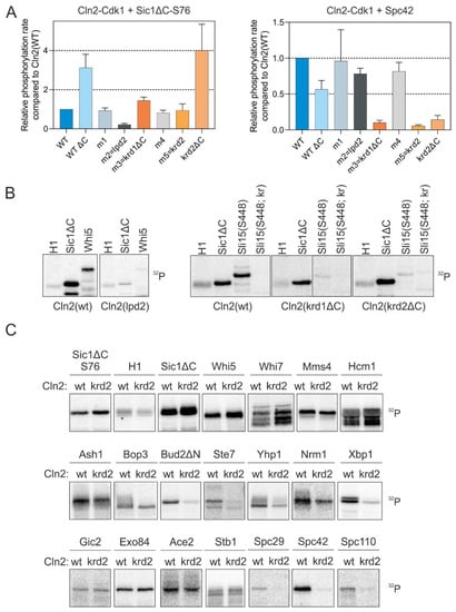 Using systematic mutagenesis of combinations of residues on the Cln2 surface, we were able to map the regions on Cln2 responsible for docking the K/R motif. We targeted regions where conserved polar residues are exposed on the Cln2 surface, introduced alanine mutations into these residues and purified the mutant Cln2-Cdk1 complexes (Figure S2). To test the docking specificity of different Cln2 mutants, we measured the phosphorylation rate of Sic1, a known LP-dependent substrate [,], and Spc42, a Cln2-specific substrate whose phosphorylation is not affected by mutation of the LP pocket (Figure 1). Deletion of the intrinsically disordered C terminus of Cln2 mildly affected the docking specificity of the Cdk1 complex, as Cln2ΔC had slightly higher activity towards Sic1 and slightly decreased activity towards Spc42, compared to the wild-type complex (Figure 3A). Cdk1 in complex with one of the Cln2 mutants (Cln2-m2 (63DQQPEMN69, where the underlined residues are mutated to alanine)) was unable to efficiently phosphorylate Sic1ΔC and Whi5, but not Spc42, indicating the absence of LP docking (Figure 3A,B and Figure S2). Cln2-m2 contained mutations in the vicinity of the known LP docking interface [], suggesting that LP motifs bind to a slightly wider area on the cyclin. Specific loss of Spc42 phosphorylation rate was observed with two Cln2 mutants, Cln2-m3(krd1ΔC (209NCLMQYE215 with deletion of the disordered C terminus 373–545 to improve protein purification)) and Cln2-m5(krd2 (334PNSLME339, where the underlined residues are mutated to alanine)) (Figure 3A and Figure S2). Mutation of either of these sites caused a loss of phosphorylation similar to the case of the K/R mutation in Sli15 (Figure 3B). These mutations were entirely specific for the docking mechanism as they did not affect the overall activity of the Cdk1 complex as judged from the phosphorylation of reference substrate Histone H1 (Figure 3B). However, the mutations in krd1 and krd2 do not point to a specific well-defined pocket on Cln2 that binds the K/R motif, as the mutations that affect K/R docking are distributed on a larger area. Thus, further studies are required to precisely map the docking interaction from the cyclin side.