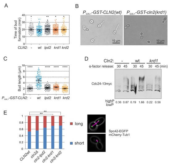 As the G1 cyclins drive bud formation [], we measured the time of bud formation from Start and observed a slight delay in the case of both lpd and krd Cln2 mutants (Figure 4A). As Cln2-Cdk1 promotes bud elongation, in contrast to Clb-Cdk1, overexpression of Cln2 causes elongated bud morphology [,]. Overexpression of the docking interface mutants did not cause the elongated bud phenotype characteristic of wild-type CLN2 overexpression indicating that both LP and K/R docking mechanisms have a role in phosphorylating substrates involved in polarized growth (Figure 4B,C). A key Cdk1 substrate in triggering bud formation is Cdc24 [,]. To test whether K/R docking mediates phosphorylation of Cdc24, we performed Western blot from synchronized cultures using Phos-tag SDS-PAGE to separate protein forms based on phosphorylation. These experiments showed that Cdc24 is phosphorylated in the early cell cycle, but the phosphorylation is considerably decreased in cells expressing Cln2 K/R docking mutant (Cln2(krd1)) at endogenous level in cln1Δ strain (Figure 4D). Thus, both LP and K/R docking interactions direct G1-Cdk1 to phosphorylate substrates to regulate bud formation.