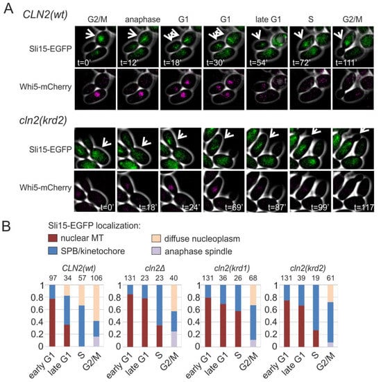 In anaphase, Sli15, a component of the Ipl1p/Aurora B complex and a chromosomal passenger protein, translocates from the kinetochores to the spindle. In G1 it stays at the broken spindles in the nucleus (Figure 5A). At G1/S transition, Sli15 moves to the clustered spindle pole bodies and kinetochores, appearing as clear dots when expressed as GFP fusion protein (Figure 5A). In the S phase and G2/M, the localization of Sli15 spreads over the nucleoplasm. This dynamic cycle is Cdk1-regulated and we asked if the K/R docking mechanism and Cln2 could play role in the G1/S transition of Sli15 from spindle fragments to SPB/kinetochores. We followed the localization of Sli15-GFP in dividing cells and found that transition from nuclear microtubules to SPB/kinetochore foci was strongly delayed in both K/R docking mutants, as shown by the diagrams for different cell cycle stages in Figure 5B.