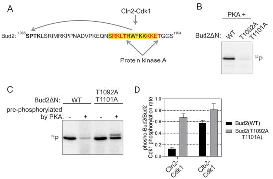 Phosphorylation adjacent to the K/R docking α-helix switches the docking off. (A) Scheme showing the sequence of Bud2 C terminus with two potential protein kinase A (PKA) phosphorylation sites in the K/R docking motif. (B) 32P-autoradiographs showing the phosphorylation of T1092 and T1101 by PKA. (C) The C terminus of Bud2 was first phosphorylated by PKA without 32P-ATP under conditions where Bud2 is expected to be fully phosphorylated at T1092 and T1101 by PKA, followed by removal of PKA and subsequent phosphorylation by Cln2-Cdk1 in the presence of 32P-ATP. “−“ indicates no pre-phosphorylation of Bud2ΔN, whereas “+” indicates that Bud2 ΔN has been pre-phosphorylated by PKA. An autoradiograph showing the inhibition of Bud2 phosphorylation by Cln2-Cdk1 by pre-phosphorylation of the substrate with PKA. (D) The effect of Bud2 pre-phosphorylation by PKA on subsequent phosphorylation by Cln2- and Clb2-Cdk1. The error bars show standard deviation.