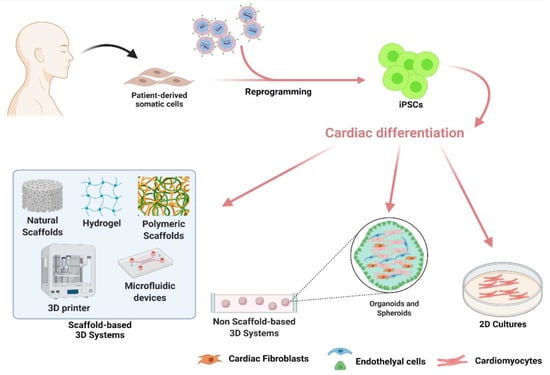 Scaffold-based 3D systems rely on combining cells and biocompatible scaffolds to recreate a functionally native tissue, recapitulating the exact cellular composition and ECM structure. The final purpose of such tissue engineering (TE) methodologies is of high clinical relevance, as they aim at replacing the diseased heart tissue [,].