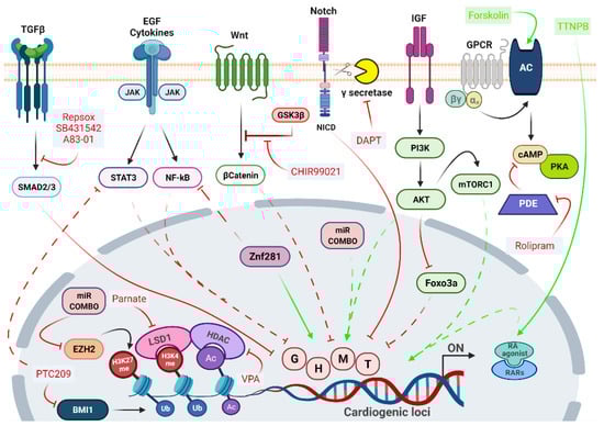 Reprogramming requires the inhibition of the fibroblast signatures with the parallel enhancement of cardiac fate, which involves a drastic chromatin remodeling occurring in the starting fibroblast to overcome existing epigenetic barriers and to acquire the CM-like chromatin pattern []. The success of such changes greatly influences the efficiency and outcome of reprogramming.