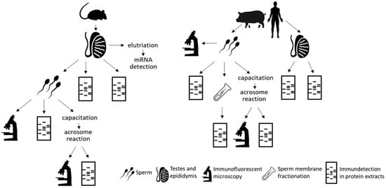 Owing to the dynamic expression of different integrins in germ cells and the importance of αV integrin during fertilization, we aimed to investigate its mRNA expression during spermatogenesis using the mouse model and then further describe the precise localization of αV integrin on sperm. To draw broader conclusions, we targeted αV integrin protein expression in individual sperm head membranes and followed its dynamic relocalization during sperm capacitation and acrosome reaction, in mouse, pig, and human. To achieve our aims, we used a wide range of methods such as elutriation of testicular suspension; qRT-PCR for αV integrin gene expression during spermatogenesis; immunofluorescent protein depiction; super-resolution microscopy, and Western blot detection in sperm and reproductive tissue extracts (Figure 1).