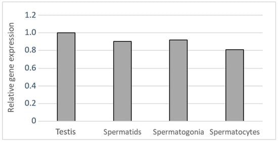 To determine the expression of αV integrin in mouse, we prepared testicular suspensions and separated individual cell populations by elutriation [,]. Using individual cell fractions, we performed qRT-PCR to define cell type enrichment in the obtained fractions. We selected fractions enriched by male germ cell subtypes using specific gene markers for spermatogonia, primary spermatocytes, and round spermatids, which are summarized in Supplementary Table S1. In addition, we also defined the somatic cell-enriched fraction containing mainly Leydig cells. In identified fractions, we detected αV integrin mRNA expression in all five individual germ cell subtypes with particular enrichment in spermatogonia, primary spermatocytes, and round spermatids (Table 1, Figure 2).