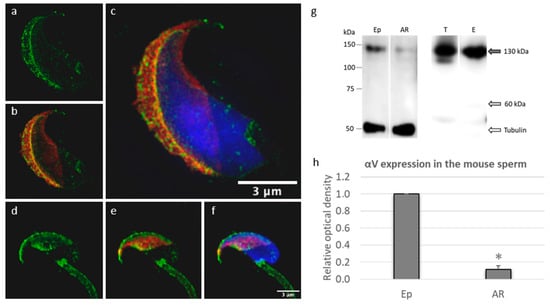 Detection of αV integrin in mouse spermatozoa and reproductive tissues. (a–c) The αV integrin (green) localization on the intact sperm head was visualized by SIM and confined to the PM defining the acrosomal region, extending to the apical hook region with a light signal over the post-acrosomal region and neck. Both OAM and IAM were detectable. (d–f) The αV integrin (green) localization after the acrosome reaction was captured by confocal microscopy and depicted strongly in IAM covering the equatorial segment including the PM extending to the post-acrosomal region enriched in the neck and tail. The PM of the apical hook region remained strongly labeled. Acrosomal status was visualized by PNA staining (red); Hoechst (blue) was used for detection of the nucleus. Scale bars represent 3 µM. (g) Western blot immunodetection of αV integrin in the extracts from epididymal sperm (Ep), acrosome-reacted sperm (AR), testis (T), and epididymis (E). Anti αV integrin antibody detected bands with a molecular weight of 130 kDa (gray arrow). (h) Western blot densitometry analysis in protein extracts normalized to the amount of tubulin shows a decreased expression of αV integrin (p < 0.05; *) in acrosome-reacted (AR) sperm in comparison with epididymal (Ep) sperm.
