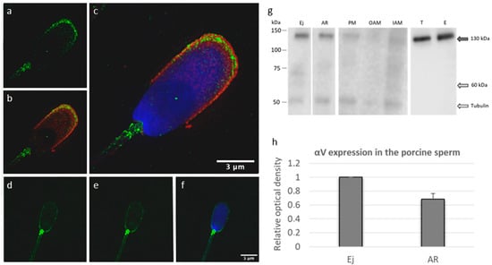 αV integrin was detected in the acrosomal cap region and in the neck of ejaculated acrosome-intact porcine sperm. Based on the images obtained by SIM, the αV integrin localization was mainly defined to the PM and both acrosomal membranes enriched in OAM overlaying the apical acrosomal area and PM covering the neck region (Figure 4a–c). During the acrosome reaction of capacitated sperm (Supplementary Figure S1), the localization of αV integrin moved (Supplementary Figure S2) across the whole acrosome-reacted sperm head and was observed in IAM and the PM covering the equatorial segment, post-acrosomal region, and enriched in the neck region when compared with acrosome-intact sperm; however, the limits of the confocal method need to be considered (Figure 4d–f). Light staining was also observed in the sperm tail but without a specific change during the acrosome reaction. To confirm the αV integrin localization in distinct sperm membranes structures, whole sperm membrane fractionation was performed to obtain a protein pool comprised of the PM, OAM and IAM. Using selected membrane fractions, the αV integrin (130 kDa) was positively detected in IAM and the PM (Figure 4g). PM detection most probably originated from the PM covering the neck region, which agrees with immunofluorescent labeling (Figure 4a–c). αV integrin was also positively detected on the PVDF membrane in the extract from ejaculated acrosome-intact (Ej) sperm and acrosome-reacted (AR) sperm (Figure 4g). Detected signals were analyzed by densitometric analysis, and the samples were normalized to tubulin. The graph (Figure 4h) reflects a decreased intensity of antibody reaction to αV integrin in the acrosome-reacted sperm (p > 0.5). The presence of αV integrin (130 kDa) was proven by Western blot analysis in protein extracts from testicular (T) and epididymal (E) tissues (Figure 4g).